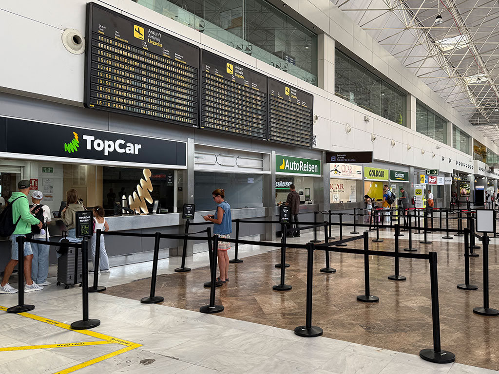Die Schalter der Mietwagenfirmen am Flughafen Teneriffa Süd (TFS) findest du in den allermeisten Fällen in der Ankunftshalle. Allerdings gibt es auch Ausnahmen wie z.B. Pluscar. Schau also am besten vorab in deiner Buchungsbestätigung und auf der Übersichtskarte des Flughafens nach, wo du dein Auto abholen kannst.