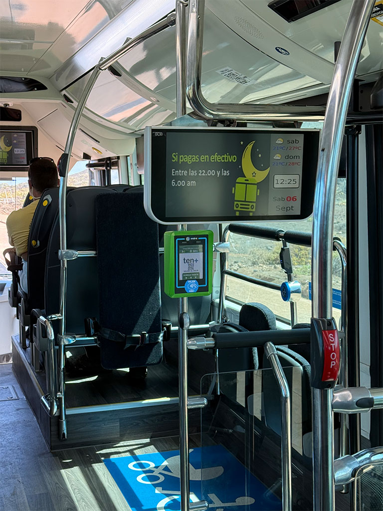 Hier noch zwei Bilder aus dem September 2025: das erste Bild vom Busbahnhof in Buenavista – die Leute stehen an, um in den Bus zur Punta de Teno zu kommen. Am Frontbereich des Busses, knapp unterhalb der Scheibe siehst du den blauen Rollstuhl-gerecht Aufkleber. Das zweite Bild stammt direkt aus dem Bus zur Punta de Teno – darauf kannst du sehen, wie der Rollstuhlbereich im Bus 369 ausschaut.
