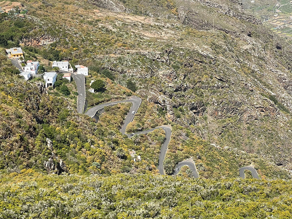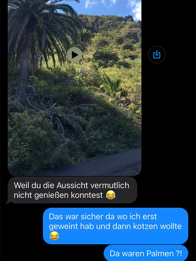 Die Tour startet gleich zu Beginn mit einer brutalen Rampe, dann schraubst du dich über feinste Serpentinen hoch ins Bergdorf. Die Anstiege sind mit teilweise über 20 % ebenso imposant wie die Aussicht auf den Atlantik bzw. die steilen, Palmen-bewachsenen Felsklippen. Theoretisch zumindest, denn das hier ist definitiv keine Spazierfahrt, eher „das Bitumen der Wahrheit“.