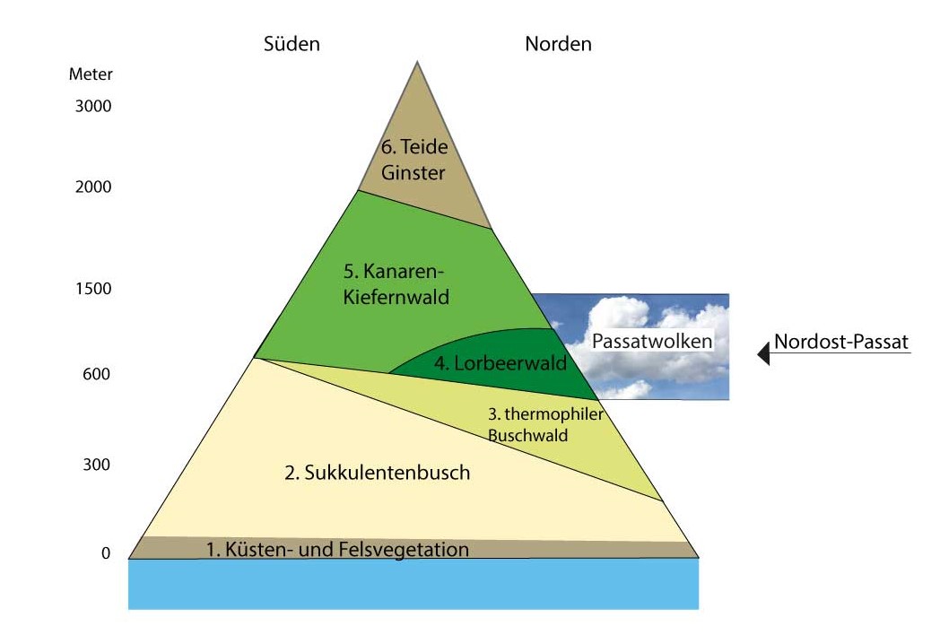 Unter ihr liegen, vom Meer in die Höhe aufsteigend: 1. Küsten- und Felsvegetation, 2. Sukkulentenbusch, 3. thermophilen Buschwald, 4. Lorbeerwald und Baumheide-Buschwälder und 5. Kanaren-Kiefernwald.